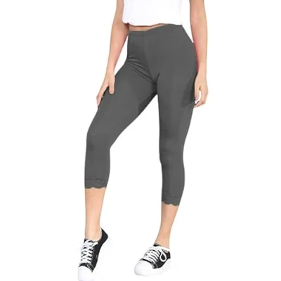 Flattering 3/4 Cropped Fit Length: Designed to fall below the knee, these capri leggings offer a breathable and stylish option for warmer weather or workouts High Rise Waistband: Elasticated high-rise fit provides support and comfort, keeping the leggings in place during movement or daily wear. Soft & Stretchy Fabric: Made with a breathable viscose blend for maximum comfort and flexibility ideal for yoga, jogging, or lounging. Fancy Lace Hem Detail: Features a delicate lace trim at the cuffs for a feminine touch adds flair to casual and active outfits. Inclusive Sizing: Available in UK sizes 8-26, these leggings are designed to flatter all shapes and sizes while offering a perfect fit.