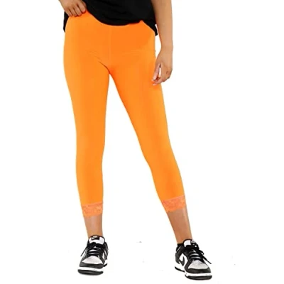 STAR FASHION Womens Ladies ¾ Cropped Capri Lace Trim Leggings Stretchy Soft Tights Yoga Pants Elasticated Waist Shorts for Jogging UK Neon Orange 16 18