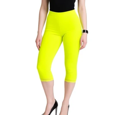STAR FASHION Womens Ladies ¾ Cropped Capri Lace Trim Leggings Stretchy Soft Tights Yoga Pants Elasticated Waist Shorts for Jogging UK Neon Yellow 16 18