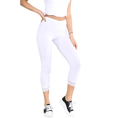STAR FASHION Womens Ladies ¾ Cropped Capri Lace Trim Leggings Stretchy Soft Tights Yoga Pants Elasticated Waist Shorts for Jogging UK White 16 18