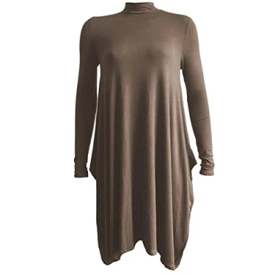 STAR FASHION Womens Ladies Polo Neck Hanky Hem Swing Dress Long Sleeve Flared Skater Turtle Roll Oversize Lagenlook Baggy Loose Top Dresses UK 8 26