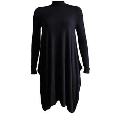 STAR FASHION Womens Ladies Polo Neck Hanky Hem Swing Dress Long Sleeve Flared Skater Turtle Roll Oversize Lagenlook Baggy Loose Top Dresses UK 8 26 Black