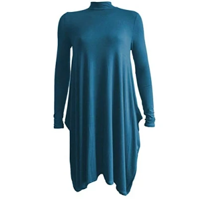 STAR FASHION Womens Ladies Polo Neck Hanky Hem Swing Dress Long Sleeve Flared Skater Turtle Roll Oversize Lagenlook Baggy Loose Top Dresses UK 8 26 Teal