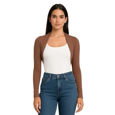 STAR FASHION Womens Long Sleeve Bolero Shrug Ladies Mini Blouse Open Front Cropped Top Lightweight Summer Cardigans Jacket Mocha 12 14