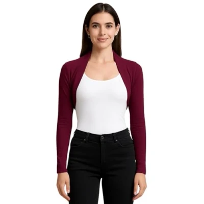 STAR FASHION Womens Long Sleeve Bolero Shrug Ladies Mini Blouse Open Front Cropped Top Lightweight Summer Cardigans Jacket Wine 12 14