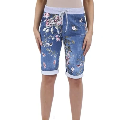 STAR FASHION Womens New Italian Printed Shorts Elastic Waist 3/4 Cropped Trousers Summer Beach Pants Magic Short Pajamas Dark Denim Floral 16 18