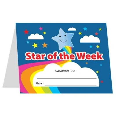 20 stand up certificates per pack Identical design Supplied flat, ready to fold 108mm x 113mm at widest points when folded A Star of the Week message which stands up on the recipient's desk