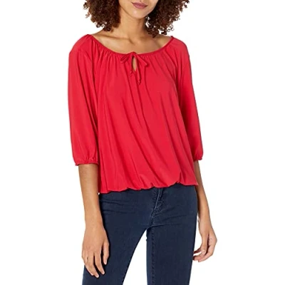 Star Vixen Women's 3/4 Sleeve Peasant Elastic Hem Keyhole Tie Top Blouse, Red, Small