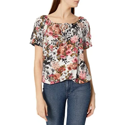 Star Vixen Women's Short/Slit Sleeve Keyhole Tie Peasant Top Bubble Hem Blouse, Light Ground Floral, Medium