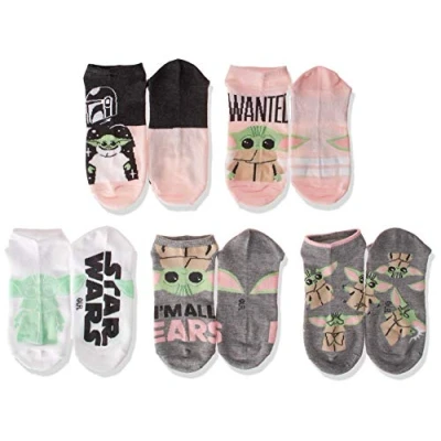 Five pairs of Star Wars The Mandalorian The Child themed socks Juniors and Ladies Age 9-Adult 5 Pack No Show Socks Fits Sock Size 9-11; Fits Shoe Size 4-9 Detailed designs and graphics of your favorite Star Wars characters