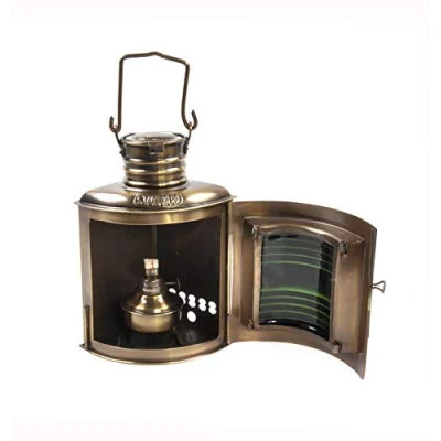 Replica, but functional oil burning Ships Navigation lamp Free-standing or wall-mounted Constructed in sturdy brass and steel. Green starboard glass lens Uses 12mm single wick 21cm tall