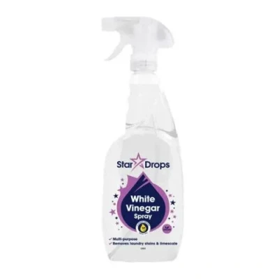 Introducing Star Drops White Vinegar Spray! This multi-purpose solution leaves a streak-free finish on glass and mirrors while effectively removing stains and limescale from various surfaces. Say goodbye to tough cleaning tasks with the power of this versatile formula. Must-have for any household!. 1 x Star Drops White Vinegar Spray 750ml. Multipurpose. Removes laundry stains and limescale. Vegan
