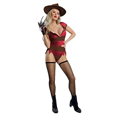 What's Included - Romper, Hat and Face piece Miss Krueger striped button front romper Cap sleeve, and slash details throughout Includes latex face piece and hat, Manufacturer: Starline