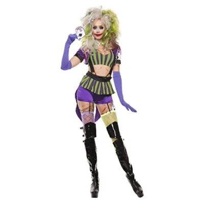 Crop top, high waist shorts, suspenders, bolero, and neckpiece included Gloves, stockings, kneepads, wig, and cards not included Purple and green striped low cut crop top and matching shorts Purple bolero with black cuffs and purple and green accent trim, Manufacturer: Starline, LLC.
