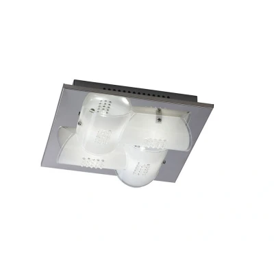 Curved frosted glass panels are mounted on the highly Polished Chrome back plate that consequently produce an attractive reflection. Each carefully designed glass piece is encrusted with three rows of petite clear crystal spheres implementing a glamorous aspect to this design. The shape of the glass has been meticulously designed so the overlapping arrangement can be achieved on the flush ceiling fitting.