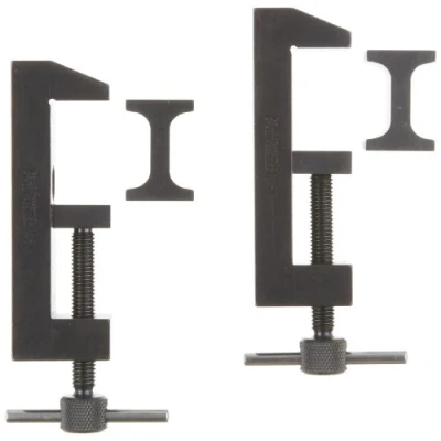 Pair of toolmakers' clamps for layout work and for securing work in drilling, welding and other operations Screw mechanism adjusts the clamp to a capacity of 2" (50mm) Two take-up blocks with each clamp slip on the end of the screw, allowing a slight swivel that angles the block to conform to the work being held A hole in the base enables fastening to a bench so the clamp can function as a small vice Made of case-hardened steel for strength and durability