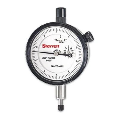 Starrett 25 611J Dial Indicator, 0.375" Stem Diameter, Lug On Centre Back, White Dial, 0 10 Reading, 2.25" 0.2" Range, 0.0001" Graduation