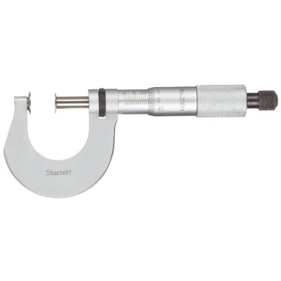 Disc-shaped faces with flanges for measuring the distance between gear teeth Vernier scale in metric units for taking precise outside diameter (OD) measurements Ratchet-stop mechanism helps provide uniform pressure for precise, repeatable measurements Satin chrome finish helps resist rust and reduce glare Knurled ring-type lock nut to hold measurements in place