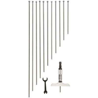 Vernier scale for precise measurements in fine units Includes 1/8" diameter adjustable measuring rods to cover the range Bases and measuring surfaces are hardened, ground, and lapped for durability and accuracy Ring-type knurled lock nut and combination ratchet and speeder for precise measurements