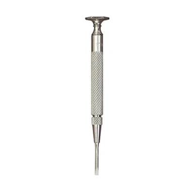 Made from steel, nicely knurled and nickel-plated Suitable for relatively small and very delicate work Swivel knob is concave to fit the finger and hexagonal in shape to prevent rolling Screwdriver blade width is 2 mm Ideal for relatively small and very delicate work Body is made from knurled, nickel-plated steel The swivel knob is concave to fit the finger and hexagonal in shape to prevent rolling The screwdriver blade width is 2 mm