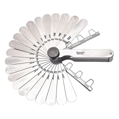 Leaves made of finest tempered-steel, carefully finished to correct thickness, individually tested and marked with thickness Leaves easily removed or replaced Rugged, substantial steel case protects leaves Locking device on gauge- permits securely locking one or more leaves in position With locking device and spark plug wire gauges