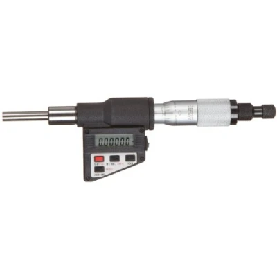 Digital, single-value readout LCD displays in inch and metric units for readability Statistical Process Control (SPC) output transmits results to a computer or external device through an interface cable (sold separately) Knurled ring-type lock nut to hold measurements in place Flat measuring face for measurement or use as a stop Micro-lapped carbide measuring face helps provide accuracy and wear resistance