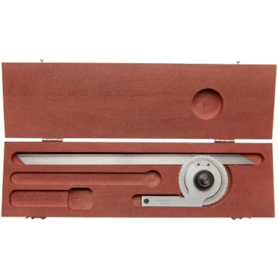 Satin chrome finish on all reading surfaces Sharp, machine-divided scale to read 5 minutes (1/12 of one degree) Blades can be rotated and length adjusted as necessary; flush surfaces on the bottom allows use on height gauge Dial and blades can be locked independently Machine-divided scale to read 5 minutes (1/12 of one degree) and accuracy is finer than can be read; the most comfortable and ultra-sensitive fine adjustment for precision frame