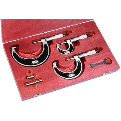 The case includes 1", 2" and 3" micrometers, two standards, adjusting wrench Starrett satin chrome finish, no glare, resists rust, advanced sleeve design with staggered lines and distinct figures for precise and easy readability Quick-reading figures every thousandth numbered on inch tools Balanced frame and thimble design insure easy handling and better readability Ring-type knurled lock nut for quick and sure locking