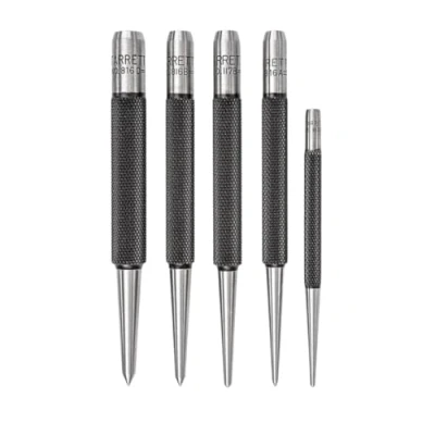 Set of five punches includes three prick punches with 5/64", 1/8", and 5/32" diameter tapered points and two centre punches with 1/16" and 3/32" diameter tapered points Prick punches provide a sharper point for more precise placement, while centre punches create a standard starter dimple Points are hardened steel for wear resistance Round shanks are knurled for grip Set comes with plastic case for storage Knurled grip for secure holding Made of steel Hardened and tempered Precision centred tips for accuracy For precise positioning of a point or intersecting of lines