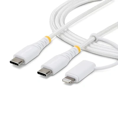 2-IN-1 CHARGING CABLE: Simplify USB charging with a durable USB-C to USB-C cable with a Lightning adapter, providing reliable connectivity for both USB-C and Apple Lightning devices; Please note that this cable only charges one device at a time DURABLE CABLE FOR DAILY USE: Durable dual-layer design combines a flexible braided nylon sheath with a TPE inner layer to prevent knotting and provide protection against abrasion; Ideal for harsh and demanding environments APPLE CERTIFIED COMPATIBILITY: Use the Apple MFi certified Lightning adapter for guaranteed compatibility and up to 30W power supply for iPhone and iPad; The cable supports USB 480Mbps for data transfer and sync IDEAL FOR MIXED SETUPS: Simplify mobile charging with a single cable compatible with USB-C chargers/hubs and power banks; Ideal for charging Apple Lightning and USB-C iPhones/iPads and also delivers up to 20V 3A (60W) for USB-C laptop charging THE CHOICE OF THE IT PRO: Our USB-C cables are thoroughly tested in our in-house Innovation Lab for reliable performance, durable construction and wide compatibility with a variety of devices; Free 24/5 multilingual technical support
