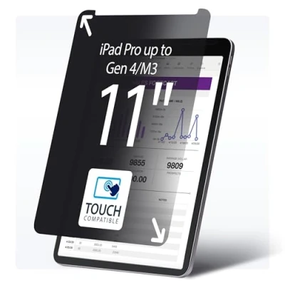PROTECT SENSITIVE VISUAL DATA: 4-way privacy screen for 11" iPad Pro featuring Micro-louver technology that obscures the view outside a 60-degree viewing angle; Keep confidential data private and prevent visual eavesdropping in public spaces or travel 11-INCH IPAD PRO: Designed to fit 11-inch iPad Pro display (up to 4th Gen, M3) without blocking the camera, sensors, or speakers; Screen protector with anti-glare matte finish; Compatibility note: Not compatible with 11-inch iPad Pro M4 4-WAY PRIVACY AND TOUCH SUPPORT: Security shield maintains privacy within a range of +/- 30 degrees from the center in portrait or landscape modes; Touch-enabled privacy filter ensures an interactive experience while safeguarding on-screen content SELF-ADHESIVE APPLICATION: Includes full installation kit and instructions for one-time application directly to the iPad screen for a secure and long-lasting fit REDUCE EYE STRAIN: iPad privacy screen protector blocks up to 51% of blue light, helping to reduce digital eye strain and improve visual comfort during prolonged use; 60% light transmittance for improved screen readability