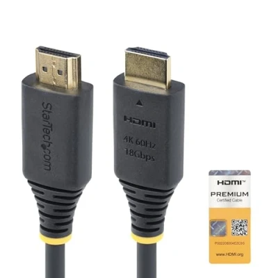 HIGH PERFORMANCE: Premium Certified HDMI 2.0 Cable is designed for UHD-enabled HDMI devices; Choose the right HDMI cable at-a-glance with performance markings on connectors for quick and easy identification; Up to 18Gbps for seamless 4K 60Hz video CERTIFIED: Premium HDMI Cable is certified for guaranteed HDMI 2.0 performance and compatibility, ensuring reliable signal consistency and smooth video playback on any HDMI display; Backward compatible with earlier HDMI versions QUALITY CONSTRUCTION: Gold-plated connectors rated beyond 10,000 insertions; Durable TPE Jacket and strain reliefs are halogen-free and RoHS compliant; Tested to withstand 2,000 bending cycles at -/+60 degrees; Braided shield for enhanced EMI protection APPLICATIONS: Ideal for 4K UHD displays, high performance GPUs and workstations; Connect an HDMI monitor to a 4K docking station with up to 144Hz refresh rate at 1440p resolution SPECS: Black; 4-meter (13.1-foot); Premium Certified HDMI with Ethernet; HDMI 2.0 supports HDR10/ARC/HDCP 2.2/CEC; 4K 60Hz/1440p 144Hz/1080p 240Hz; 18Gbps; 32-ch Audio; Backward Compatible; 28AWG; 7.3mm (0.29in) O.D.
