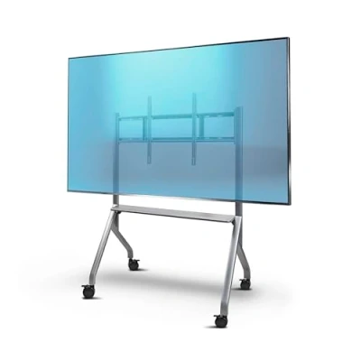 STREAMLINE MOBILITY FOR LARGE-FORMAT DISPLAYS: Modern easel-style movable TV cart safely and smoothly moves screens up to 100-inch and 220lb (100kg) between boardrooms and classrooms while keeping a sleek and minimalistic aesthetic ADJUSTABLE HEIGHT: Set the height of the interactive board or display based on the screen size or the audience's viewing needs, using the three height positions from 49.1 to 56.2in (1.25 to 1.43m) measured from the floor to the center of the TV SAFER SPACES AND EASY MOBILITY: Easel-style frame clearly stands out from all angles, minimizing tripping hazards in high-traffic areas; Smooth-rolling and lockable 3in (7.5cm) wheels provide controlled movement through standard doors, hallways, elevators DISPLAY COMPATIBILITY AND DURABILITY: Supports VESA up to 1000x600mm, making it a versatile fit for smart whiteboards, commercial TVs, and digital signage, while its steel construction and powder-coated finish withstand daily use and clean easily KEEP ESSENTIAL ACCESSORIES WITHIN REACH: Mobile TV stand features an integrated 7.5in (19cm) wide shelf providing a convenient spot for a laptop, pens, laser pointers, or other small accessories used in classrooms and boardroom setups