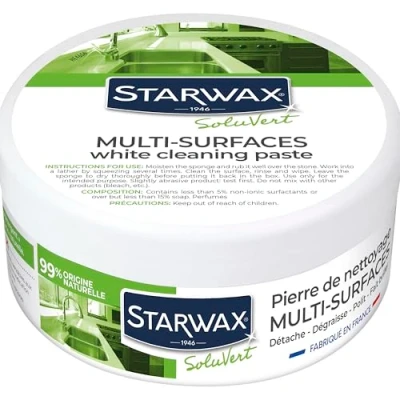 TO CLEAN, PROTECT AND SHINE: The Starwax Soluvert white cleaning paste is very versatile. It is ideal for cleaning and shining all types of surfaces, including those in contact with food, while protecting them. USEFUL AROUND THE HOME AND GARDEN: Starwax Soluvert cleaning paste comes with a double-sided sponge for easy application. It is also practical for cleaning planchas and barbecues, furniture and windows, and even swimming pool water lines! A FORMULA WITH 99% NATURAL ORIGIN INGREDIENTS:The cleaning white stone’s formula contains active agents that are 99% of natural origin, including kaolin. It is an eco-designed product. DAMPEN, RUB, RINSE: Dampen the sponge and then rub it on the white cleaning paste. Rub the surface to be cleaned using a circular motion. Rinse, wipe and allow to dry. THE POWER OF NATURE: Starwax Soluvert is the solution for people who demand high standards and are concerned about their environmental impact. The formulas are at least 95% natural origin, while being as effective as the traditional Starwax products.