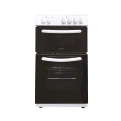 Double oven with fan assisted main oven. Ceramic hob and integrated grill. Moulded enamel oven walls. 2 chrome oven shelves. 1 deep tray with wired chrome grid. Removable double glazed doors. 2 oven lights. Pre-fitted cable.