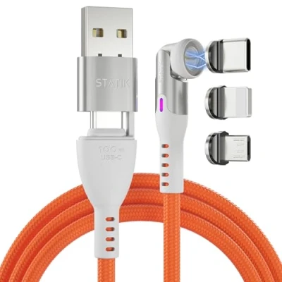 Statik 360 Pro Magnetic Charging Cable Fast Charger USB C Cable, Phone 3 in 1 to C, Micro & iProduct Tips, A Adapter 100W Orange 6FT/2M