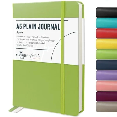BE THE BEST YOU EVERYDAY - STATIONERY ISLAND A5 blank journal notebook is your new inseparable companion! Whether you use it for studying, writing, travel journal, diary, planning, doodling or calligraphy, it’s perfectly suited to realise all your thoughts, ideas and expressions and share them with the world. 120GSM PREMIUM PAPER - With 180 pages of thick, high quality plain paper, our journal notebook is thicker than other brands and it can withstand brush pens with minimal or no bleeding. Unlined paper allows you to arbitrary layout of each of your pages. 2 BOOKMARKS, 1 POCKET - Our unlined notebook let you create cute or aesthetic spreads and keep tabs of your most important pages with 2 ribbon bookmark dividers, whilst all your essential accessories and supplies such as stickers, rulers, stencils, and tabs will fit neatly into the expandable pocket. HARDCOVER & SECURE CLOSURE - Our plain notebook boasts a strong and stylish faux leather hardcover and hardback, whilst the elastic closure band keeps all your loose contents firmly in place. As a result, it can accompany you anywhere! WIDE USE & NICE GIFT - Stationery Island blank notebook will be your popular choice for everyday use, you can also use it as your plan work, conference, class, travel, journal notebook, daily planner, notepad to focus on your ideas. It is also a nice gift for the one you care.