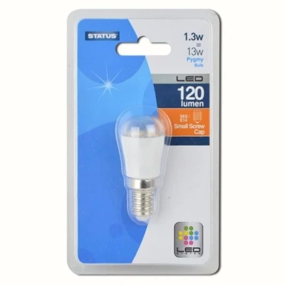 Status 1.3W LED SES Pygmy Bulb The Status 1.3SLPSES 1.3 Watt Pygmy Lamp in Warm White (120 Lumen) Non-Dimmable LED provides the same level of light as a 13W bulb while only consuming 1.3W of energy and lasting up to 15,000 hours. An Energy Efficient and Long Lasting Solution. Saves you Money - This bulb can save you over £20 of electricity over its lifetime. Every base is a standard fit, so switching over is hassle-free. Flicker Free, Instant Start Up. Technical Specifications: Type: LED Cap: Small Edison Screw Wattage: 1.3W Equivalent Wattage: 13W Colour Temperature: Warm White (2700K) Average lifespan: 15,000 hours Switching Cycles: 15,000 Cycles Energy Consumption: 1.3kWh/1000h Energy rating: A+ Bulb size: 61mm(Length) x 26mm(Diameter) Dimmable: No Comes with a 12 Month Manufacturer's Warranty.