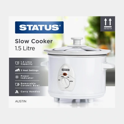 table.table1 { width: 100%; } img.smallscreen { display: none; } @media only screen and (max-width: 760px), (min-device-width: 768px) and (max-device-width: 1024px) { table, tbody, td, tr { display: block; } td { position: relative; padding-left: 50%; } td:before { top: 6px; left: 6px; padding-right: 10px; white-space: nowrap; } img.bigscreen { display: none; } img.smallscreen { display: inline; } } Status Austin Round Slow Cooker, 120 W, 1.5 litres, White Easy-clean non-stick ceramic bowl Removable bowl 2 heat settings Dimensions: 19.5 x 23 x 18.5 cm Enhance your culinary experience and upgrade your kitchen with the Austin slow cooker from Status. Boasting a generous capacity of 1.5 Litre, you can now create a variety of delicious, home-cooked dishes for all the family to enjoy. Featuring two different heat settings, you can now lift the limitations from your cooking allowing you to inject flavoursome variety into your mealtimes. This slow cooker also features a robust glass lid and heat resistant knob. Includes a removable bowl, making it ideal for serving meals straight to the table. Comes complete with measuring cup and spatula. Comes with a 1 Year Manufacturer's Warranty