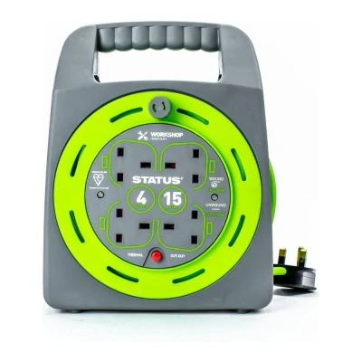 - This Status cable reel is ideal for powering appliances in your home, garage, or workspace- It's got a long 15-metre cable that reels back in to avoid tangling- There are four plug sockets, so you can run multiple devices from a single power source- The compact design makes it easy to transport and store - there's a carry handle too