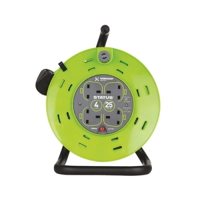 Status 25 Mtr 13 amp M Frame 4 Socket Outlet with Thermal Cut Out Green Cable Reel
