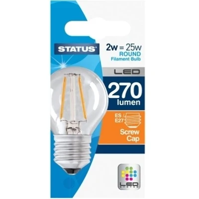 2W Round LED Filament Bulbs- Choose Between Bayonet Cap, Edison Screw Cap, and Small Edison Screw Cap Bulbs. BC Round 2w Filament Status This lamp is a 2w Golfball LED Filament style which is the equivalent of a 25w conventional lamp. With a light output of 270 lumens and a Bayonet Cap its ideal for general use around the house or added to a jar light. This lamp is non dimmable and has a average life of 15,000 hrs Diameter is 45mm Length is 70mm Status ES LED Clear Filament Round Bulb 2W 2W=25W 270 Lumen ES/E27 Screw Cap This lamp is non-dimmable LED SES Round 2w Filament Status This lamp is a 2w Golfball LED Filament style which is the equivalent of a 25w conventional lamp. With a light output of 270 lumens and an SES (small screw) cap its ideal for general use around the house or added to a jar light. This lamp is non-dimmable and has an average life of 15,000 hrs Diameter is 45mm Length is 70mm