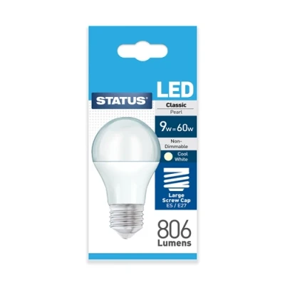 Status 9w = 60w 806 lumens LED A60 GLS ES PA Pearl Warm White