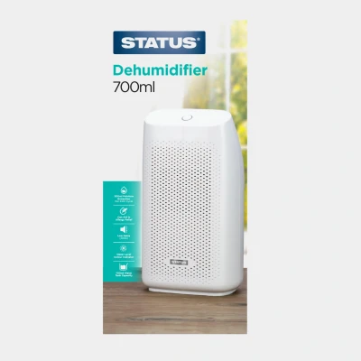 The Status 0.7 Litre Dehumidifier offers an efficient, easy way to manage excess moisture and damp in your household. Able to extract up to 700ml of moisture in just two days this dehumidifier works best in smaller spaces such as bedrooms. This Status dehumidifer gets rid of damp and moisture from your room and keeps the air drier It can extract up to 700 ml of moisture in two days - ideal for a small bedroom or an office The auto shut off feature gives you peace of mind, so you can leave it on overnight Your good night's sleep won't get disturbed by any noise - it runs super quietly at 35 db(A) Dimensions: 110 x 165 x 355 mm (H x W x D)