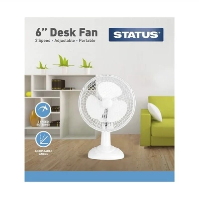 POWERFUL AIRFLOW WITH 2 SPEED SETTINGS: Experience a refreshing breeze on hot days with the STATUS Portable 6-Inch Desk Fan's two-speed settings. Whether you need a gentle cooling effect or a stronger blast of air, this fan ensures you stay comfortable in any environment. CUSTOMIZED COMFORT WITH ADJUSTABLE ANGLE: Enjoy personalized airflow with the adjustable angle feature of the STATUS Portable 6-Inch Desk Fan. Direct the airflow exactly where you need it, whether it's for cooling yourself while working, improving ventilation, or simply enhancing your comfort in any room. EXTENDED REACH WITH 1.8 METRE CABLE: The STATUS Desk Fan comes with an approximately 1.8-metre cable, providing you with the flexibility to position it further away from the power source. Say goodbye to limited mobility and enjoy a cooler atmosphere from a distance. EASY TO CARRY WITH BUILT-IN HANDLE: The STATUS Portable 6-Inch Desk Fan comes with a convenient built-in carry handle, making it effortless to move and position the fan wherever you need it most. Take it from your desk to the living room, bedroom, or office and enjoy cooling comfort with ease. SPACE-SAVING DESIGN: With its compact size and portable design, the STATUS 6-Inch Desk Fan is the perfect cooling companion for smaller spaces. Save valuable desk or table space while still enjoying efficient and powerful airflow, making it an ideal addition to any home or office., Manufacturer: Status