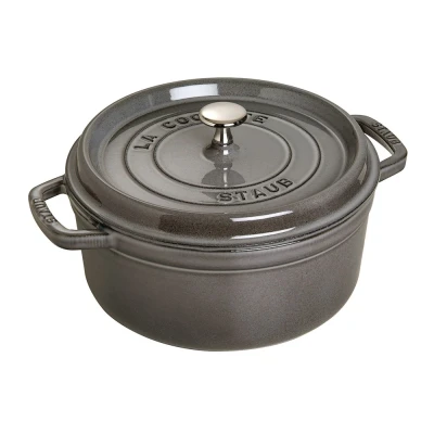 The cocotte originated in France where this casserole dish was designed to cook chicken dishes: in fact, the word "cocotte" itself is the French word for "little hen". Since then, however, the cocotte casserole dish has been used to make a wide variety of other dishes including soups, stews and ragouts. Beginners can use them as they try their hand at tasty oven-baked dishes and professional French chefs can't do without them for gratins or delicate soufflés.This particular cocotte is grey, adding a hint of elegance when presenting food at the table, round and has a diameter of 24 cm. As well as being aesthetically pleasing, cast-iron is an excellent heat retainer and is good at distributing heat equally, characteristics which are enforced by Staub's special matte black enamel. This enamel also helps preserve a food's unique flavour.Since a cocotte retains heat well, meat and vegetables can be cooked gently whilst preserving both flavour and nutritional content. It is therefore perfect for cooking healthy meals. Its specially designed lid also releases condensation at regular intervals, keeping meat wonderfully succulent. With the Staub cocotte, you can treat yourself and your guests to beautifully tender meat and delicious-tasting vegetables at any time.Ideal for searing and slow cooking of meat, fish or vegetablesJuicy and tender cooking result thanks to the lid’s special drip structureThe matt black inner enamelling is ideal for particularly crisp searing and is especially durableSuitable for all types of hobs, incl. induction, can also be used in the oven/grillRim diameter 24cmServes 4 peopleBase Diameter: 19.2cmDiameter: 24cmHeat Resistance: yesHeight without lid: 10.5cmHeight: 15.3cmInduction Compatibility: yesLength: 30cmVolume: 3.8lWeight: 4.6kgWidth: 24cm