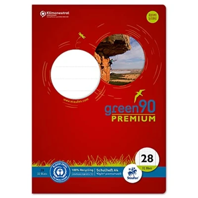 Clever calculation: environmentally friendly exercise book in DIN A4, 32 sheets, line style 28 (5 mm squared with margin line) Quality: made from 100% premium white 90 g/m² recycled paper No kinking: sturdy cover and rounded corners ensure durability Good conscience: awarded the "Blue Angel" environmental label For the sake of your environment: all Staufen Green products are produced by a climate-neutral company