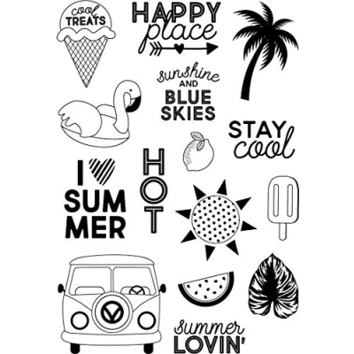 Sunshine & Blue Skies - Stay Cool 4x6 Stamps Fifteen polymer clear acrylic stamps featuring phrases, ice cream, camper van and more Perfect for your next papercrafting project.