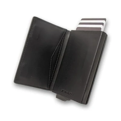 SLIM, STYLISH, AND SECURE: The Stealth card wallet is designed to be slim and lightweight, making it the perfect choice for the modern minimalist. Crafted with a blend of aircraft-grade 6061 aluminum and faux leather, this smart wallet effortlessly combines style with durability. Enjoy added security with magnetic closure! ADVANCED RFID BLOCKING: Safeguard your sensitive information with confidence. The Stealth Wallets RFID wallet will block all unwanted scanning, ensuring your credit and bank cards remain secure from electronic theft, providing peace of mind in today's digital age. STORE UP TO 11 CARDS: Designed for everyday use, this RFID card holder is perfect for those who appreciate convenience without sacrificing style. The metal wallet easily fits into fitted trousers or suit pockets, providing a sleek solution for carrying up to 5 embossed bank/credit cards or 8 standard store/business cards. POP-UP CARD FEATURE: The pop-up button mechanism ensures quick and easy access to your cards, while the cards are neatly spread when ejected for convenient selection. Additionally, the leather section features three non-RFID protected pockets, ideal for storing extra cards or cash, ensuring you're always prepared for any situation. ELEVATE YOUR GIFTING EXPERIENCE: The Stealth wallet metal card holder comes neatly packaged in a stylish gift box, making it an ideal present for any occasion. Surprise your loved ones with a practical and sophisticated accessory that doesn't compromise on style.