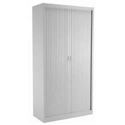 A flexible alternative to wooden storage, this steel tambour cupboard includes 4 shelves. 50kg weight tolerance. Lockable side-opening shutter door. Anti-tilt mechanism. Can incorporate a mix of flat shelves and suspension frames.